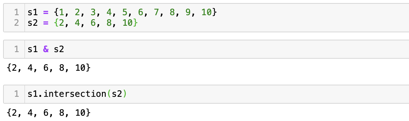 다음과 같이 s1의 세트에는 1부터 10까지의 값을 넣고, s2는 그중 짝수의 값을 넣었다. 그 뒤 &를 이용하여 두 세트의 교집합을 구해보면 {2, 4, 6, 8, 10}이 출력됨을 알 수 있다. .intersection( ) 을 이용해도 동일한 결과가 출력된다.