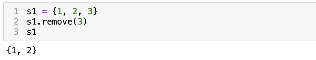 세트의 특정 값을 제거하고 싶다면 .remove( )함수를 이용하여 괄호 안에 제거하고 싶은 값을 적어주면 된다.