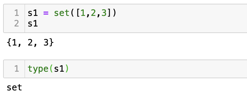 마지막으로 중괄호{ }를이용하여 바로 세트를 선언할 수도 있다. s1 = {1, 2, 3}을 선언한 뒤, type( )을 이용하여 s1의 타입을 확인해 봤을 때 set가 출력된다.