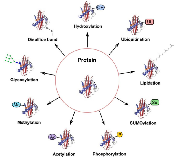 - 단백질이 만들어지고난 다음, 단백질의 function을 fine-tuning 하기 위해( 기능을 조절하는 역할) PTM이 붙는 것