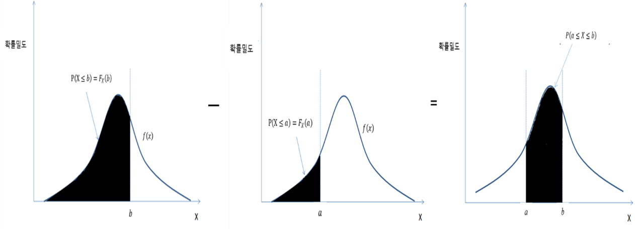 - 누적분포함수를 이용한 P(a ≤ X ≤ b) = P(X ≤ b) - P( ≤ a) = Fx(b) - Fx(a)