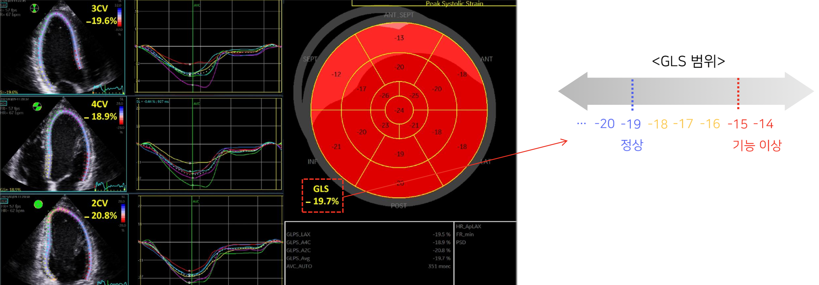 - 보편적으로 심장의 기능을 평가하기 위해 LVEF가 많이 사용되지만, 항암 요법을 시행하는 환자들의 경우, LVEF는 정상범위에 있더라도 GLS는 감소할 수 있다.