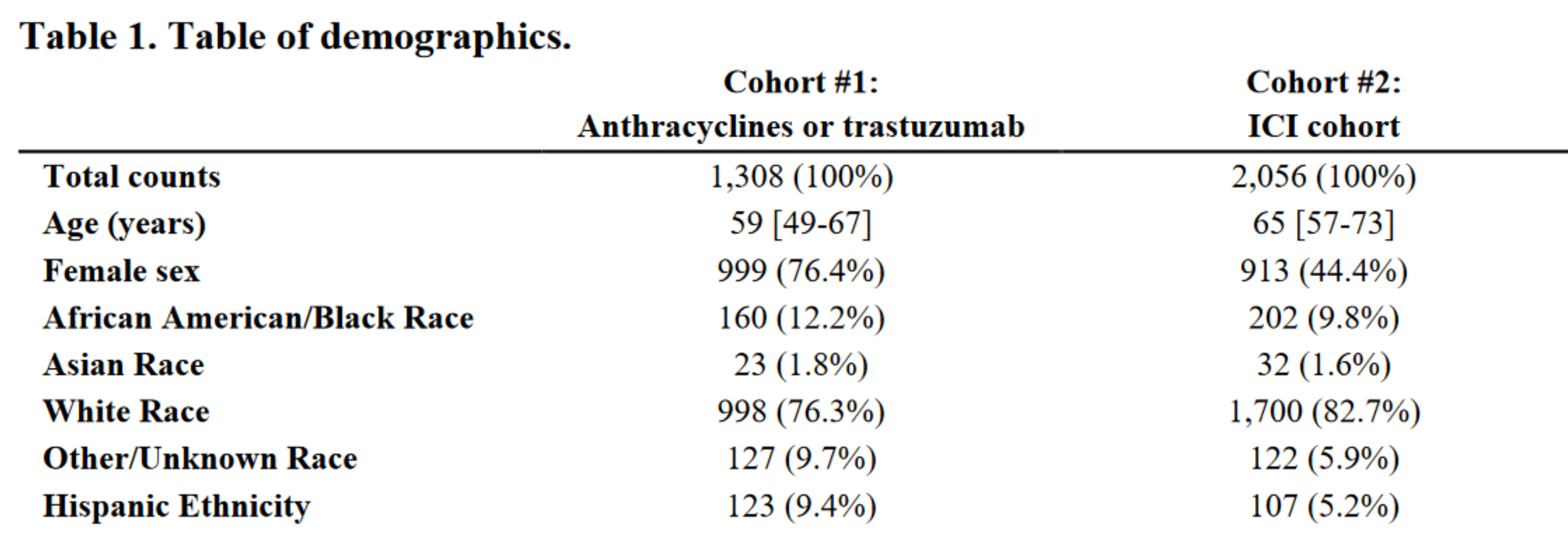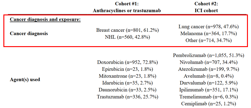 - 안트라사이클린(약재 1), 트라스투주맙(약재 2), ICI(약재 3)로 항암 & 종양 치료를 받은 환자들을 대상으로 전체 population을 형성하고, 이 중, ICD-9 & 10 진단 코드를 활용하여 다시 두 개의 코호트로 분할하였다.