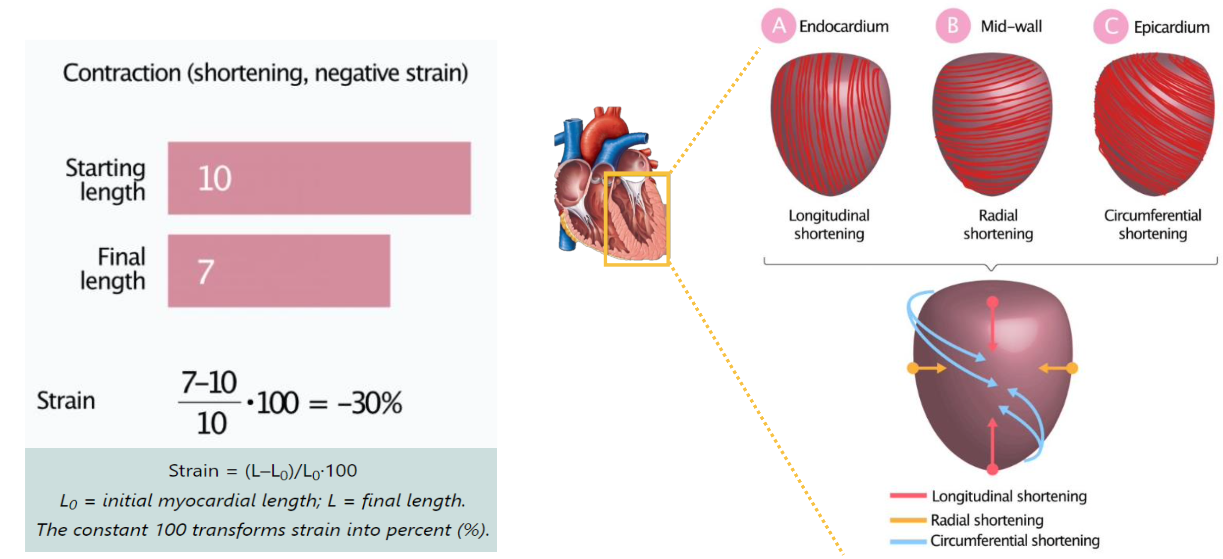 - GLS의 계산은 (왼쪽의 수식참고) 처음 길이가 10이고, 최종적인 길이가 7이라고 가정했을 때, 최종 변형률은 -30%로 계산된다.