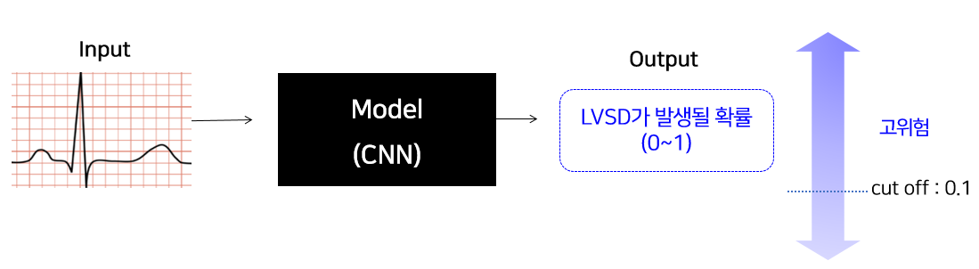- 해당 연구에서는 이전에 검증된 CNN기반의 AI-ECG 모델을 활용하여 각 ECG 이미지 데이터에 대해 LVSD 발생 확률을 0~1 사이값으로 계산하였고, 이 예측값을 0.1을 기준으로 그 값 이상인 경우 LVSD위험이 높은 것으로 간주하였다.