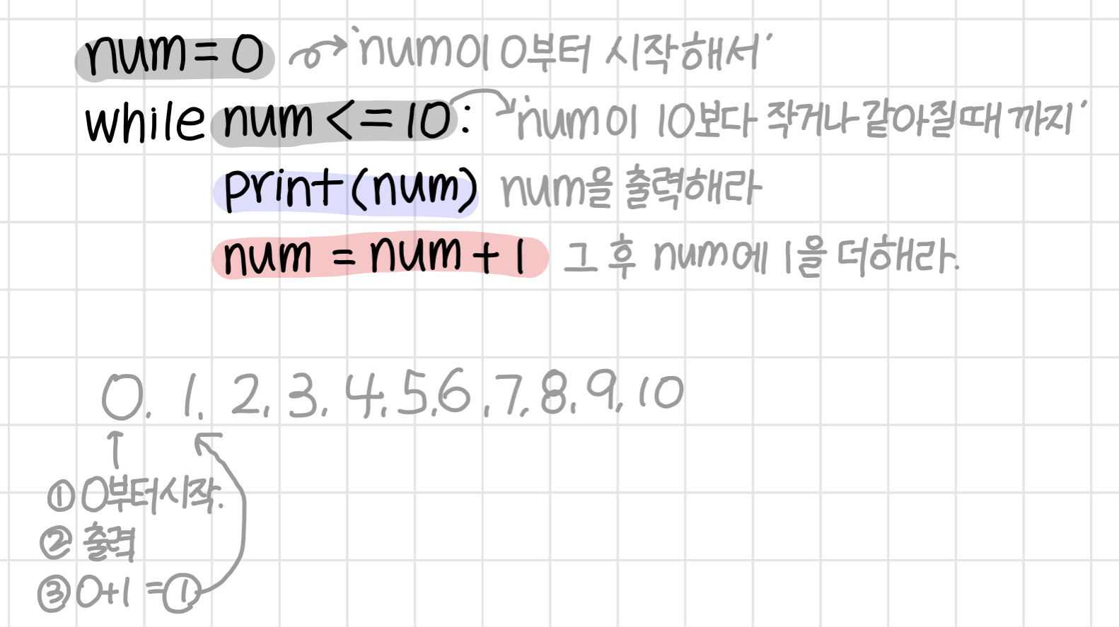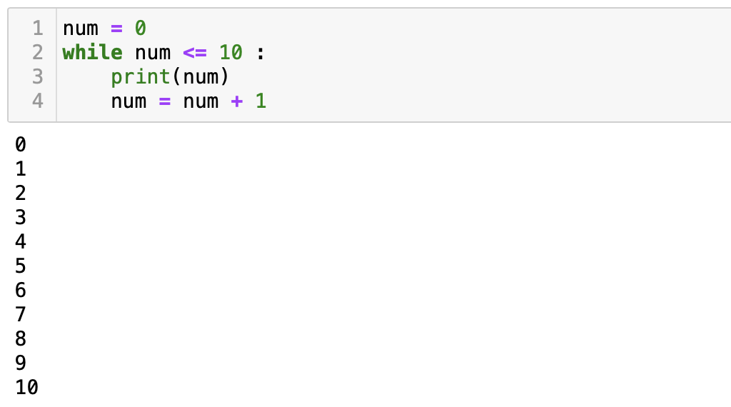위의 예제를 보면 우선 num = 0으로 선언했다. while num <=10이라는것은 num이 0부터 시작해서 10보다 작거나 같아질 때까지 while문을 반복하겠다는 의미이다. 그 while문의 조건에 해당될 때 (True일 때) 어떤 것이 수행되는지 보자면 print(num) , num = num +1 즉, num값을 각각 출력하고, 그 후 num을 1씩 증가시킨다는 의미이다. 따라서 위의 코드를 실행시켜보면, 0부터 시작해서 10까지 각각의 값들이 출력되었음을 알 수 있다.