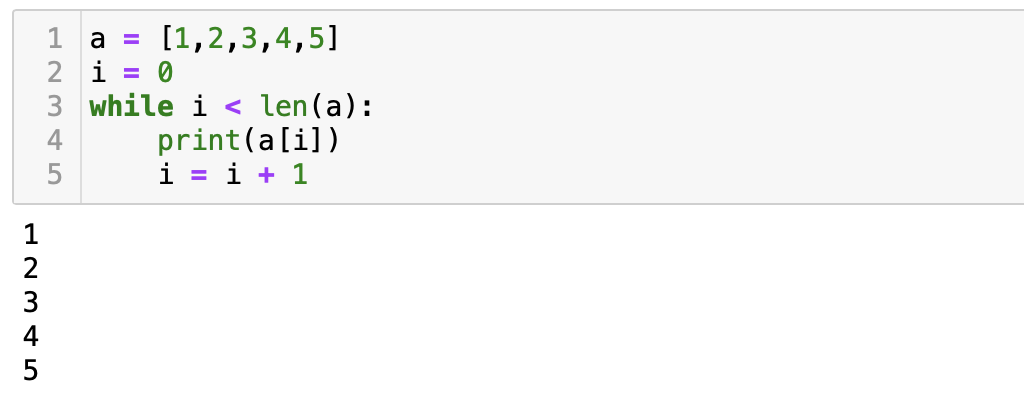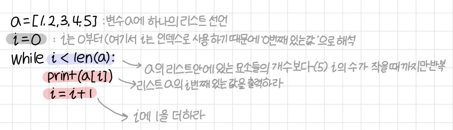 이번에는 while문을 이용하여 리스트에 있는 값들을 차례로 출력해보자. 변수 a에 하나의 리스트를 선언하고, i를 인덱스로 사용하기 위해 우선 0으로 선언해준다. 그 후, i < len(a)로 i가 리스트의 길이(요소의 개수) 직전까지만 반복하도록 만든다. 즉, 리스트의 인덱스는 0부터 시작하고, 마지막 인덱스는 리스트의 길이보다 1이 작으므로 <(미만)을 사용한다. 만약 i <= len(a)처럼 <=(이하)를 사용하면 리스트의 범위를 벗어나게 되므로 주의한다. while문의 조건을 만족하는 경우 a의 리스트의 [인덱스] 값을 하나씩 출력하고, 그 후 i의 값을 1 증가시켜 다음 인덱스의 값을 출력하도록 만들어주면 된다.