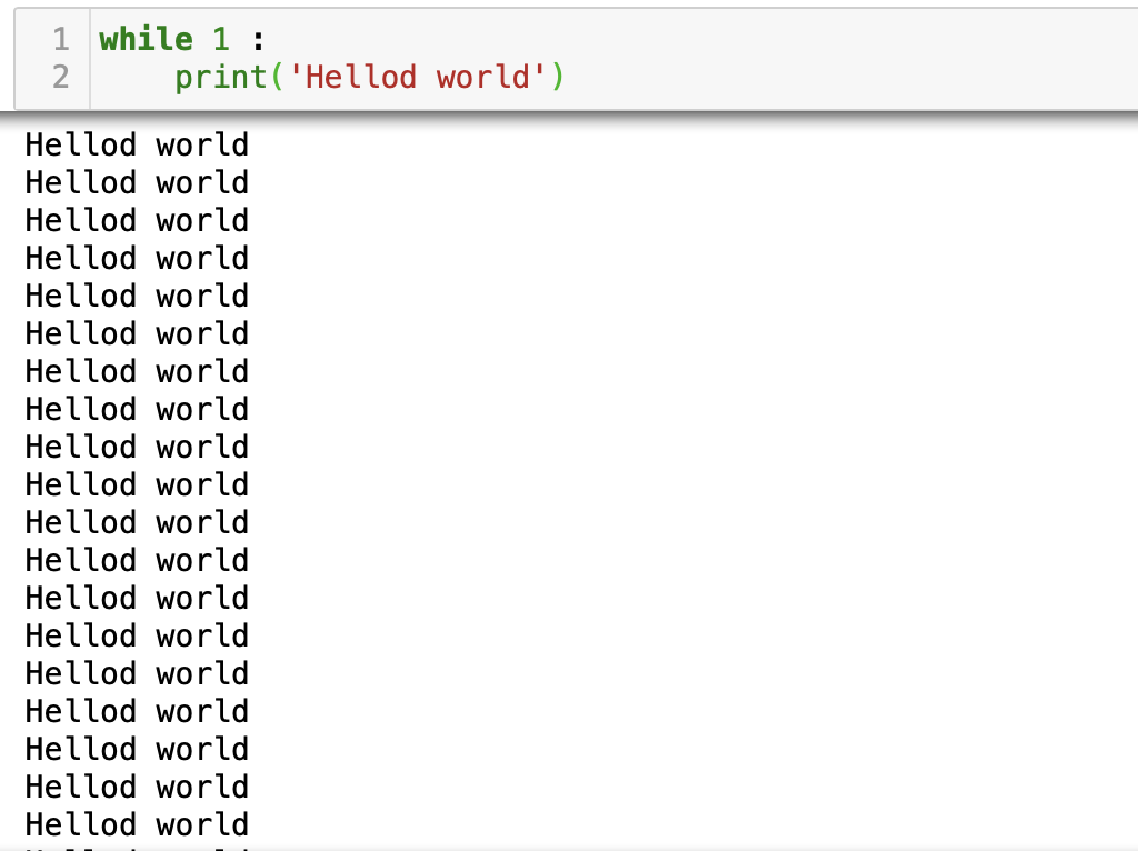 위의 코드를 보면 while 1 : 로, while의 값을 True로 설정한 뒤(이때 왜 True인지 모르겠다면 클릭하여 3번 내용 다시 확인할 것), print ('Hello world')를 했을 때 Hello world가 끝없이 출력되는 것을 알 수 있다. 이때 무한루프를 멈추고 싶다면 ctrl + c를 눌러주면 된다.