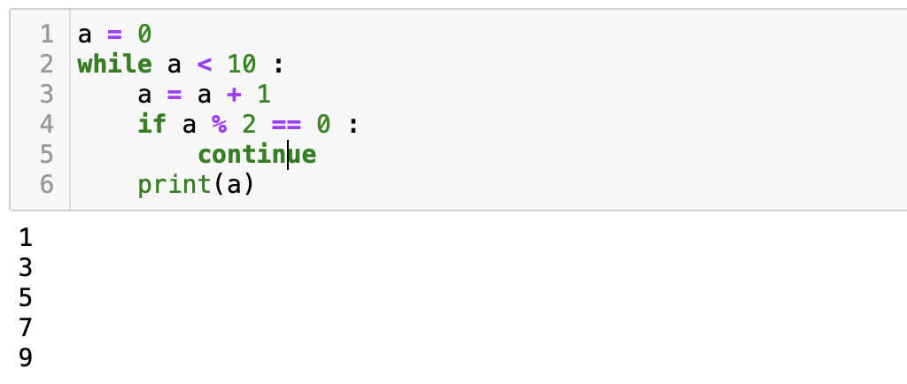 위의 예시에서, 0부터 10 미만의 숫자 중에서 홀수의 값만 출력하고 싶다. 방법은 여러 가지가 있겠지만 while문을 이용해보자면 a가 홀수인 경우에는 그것을 출력하고, 짝수인 경우에는 출력하지 않고 그냥 지나는 방법을 이용하면 된다. 위의 코드를 작성해서 출력해보면 홀수의 값만 출력된 것을 알 수 있다. 여기서 주의할 점은 a = a + 1처럼 값을 변경해주는 코드가 continue보다 위에 위치해야 한다는 점이다. 만약 이 문장이 continue 아래에 위치하게 되면 무한루프에 빠지게 된다.