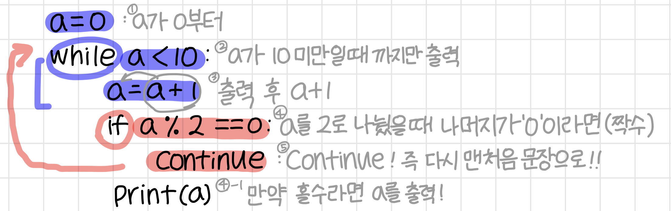 break가 while반복문을 완전히 빠져나올 수 있게 하는 것이었다면, continue 는 반복문을 계속 돌다가 특정 조건을 만족할 때 아래 코드들을 무시하고 바로 반복문의 맨 위로 올라가게 만들어주는 것이다. (즉, 중간에서 맨 처음으로 올라가는 것)