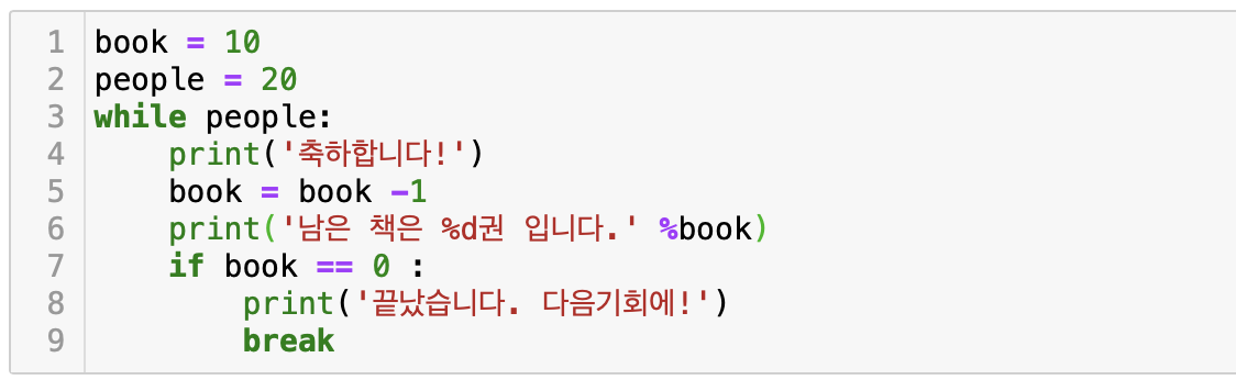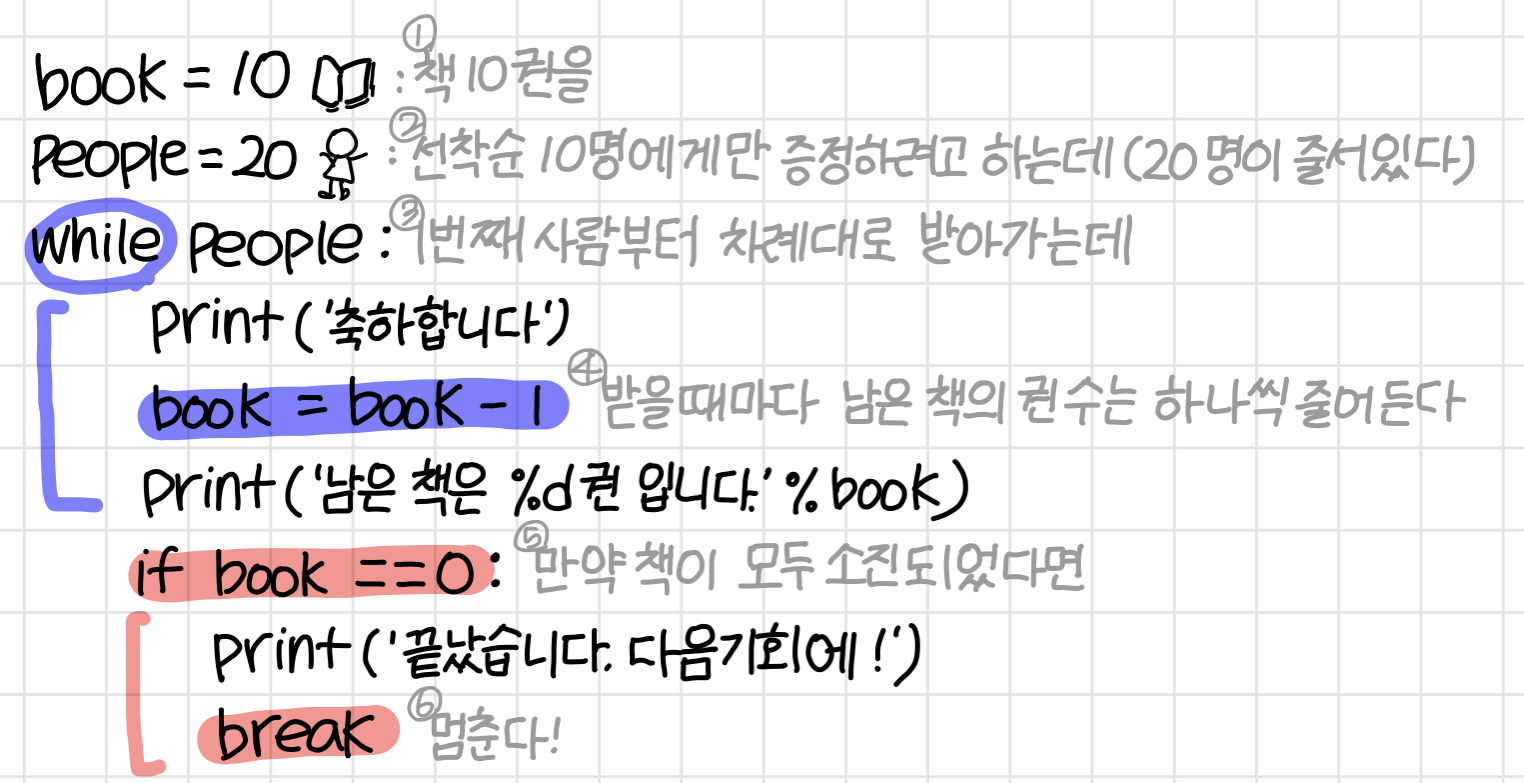 whlie문은 조건문이 참인 조건 하에 계속해서 while문 안의 내용을 반복적으로 수행한다. 하지만 강제로 while문을 빠져나가고 싶다면 어떻게 해야 할까? 위의 코드를 보면 선착순 10명에게 책을 무료로 제공하려 한다. 하지만 선착순 10명에게 모두 책을 제공했고 이제 더 이상 책이 남아있지 않다면 그것을 사람들에게 알리고 중지해야 한다. 이럴 때 사용하는 것이 'break' 이다. 위의 예시를 보면 people이 20으로 고정되어 있다. 즉 0이 아니기 때문에 항상 참(True)이 된다. 따라서 무한히 반복되는 무한루프를 돌게 된다. (왜 항상 참인지 잘 모르겠다면 클릭하고 3번 내용을 확인해보자) 그리고 while문의 내용을 한번 수행할 때마다 book = book -1 에 의해서 book의 개수가 1씩 줄어든다. 만약 10명의 사람이 선착순으로 모든 책을 가져갔을때 book == 0의 조건이 참이 되므로, if문에 종속된 문장인 '끝났습니다. 다음 기회에!'라는 문장이 출력되고 break에 의해 while문을 빠져나가게 된다. 위의 예시처럼, break는 while문을 수행하다가 특정 조건이 만족된 경우에 while문 자체를 빠져나오고 싶을 때 사용한다.