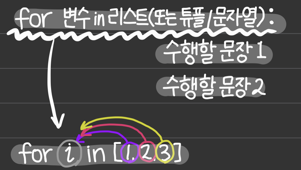 for문은 while문처럼 for문 또한 끝에는 콤마(:)를 사용하고 , 수행할 문장들은 들여 쓰기를 통해 구분해주어야 한다는 점은 동일하다. for문의 기본 구조를 조금 더 구체적으로 살펴보자면, for 변수 in 리스트 에서 리스트에 있는 값들을 차례대로 하나씩 변수에 대입되고 그 이후에 수행할 문장들이 수행된다. for문에서는 리스트(튜플, 문자열 등) 더 이상 꺼낼 요소들이 없어지면 반복이 종료된다. 또한 파이썬에서의 for문은 인덱스 별로 하나씩 각 값들을 뽑아오는 개념이 아니라 그냥 순서대로 빼오는 것에 가깝다.