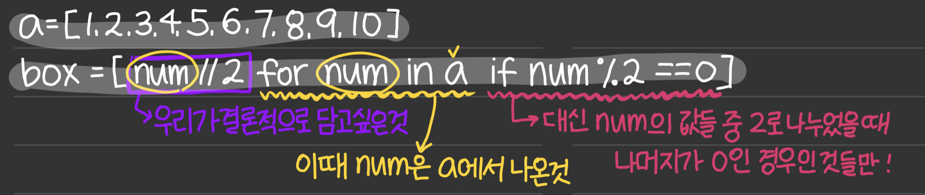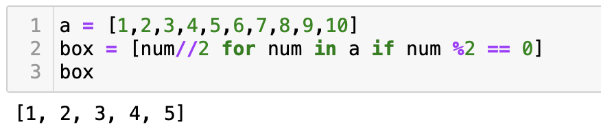 그렇다면 위의 코드를 같은 원리로 해석해보자. box = [num//2 for num in a if num % 2 == 0] 에서, 우리가 결론적으로 담고 싶은 것은 num//2로, num에 2를 나누었을 때의 몫들을 box에 넣고 싶은 것이다. 이때 num은 리스트 a에서 나온 값이며, if num % 2 == 0이라는 조건문을 이용하여 조건을 걸어주었다.