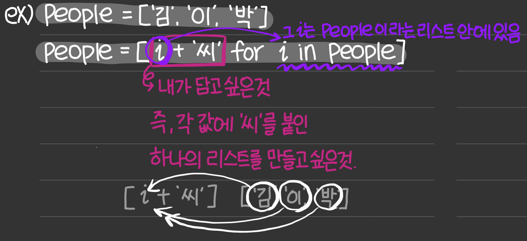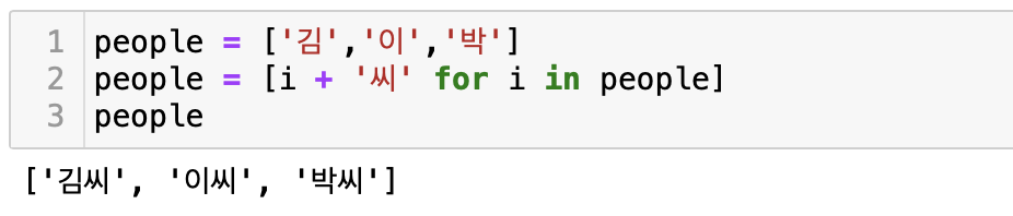 이번에는 ['김','이','박']이라는 성 뒤에 '씨'를 추가하여 성씨를 완성해보고자 한다. 먼저 변수 people에 하나의 리스트를 만들어 '김', '이', '박'을 넣어준다. 그다음 i(임시 변수)에 각 값들에 '씨'를 더한 하나의 리스트를 만들면 된다. 여기서 i는 아까 만든 리스트인 people에서 값들을 하나씩 뽑아 '씨'를 붙인 것들을 담는 상자라고 생각하면 된다. 따라서 최종적으로 people을 출력해 보았을 때 원래의 리스트 값들에 각각 '씨'가 붙었음을 알 수 있다.