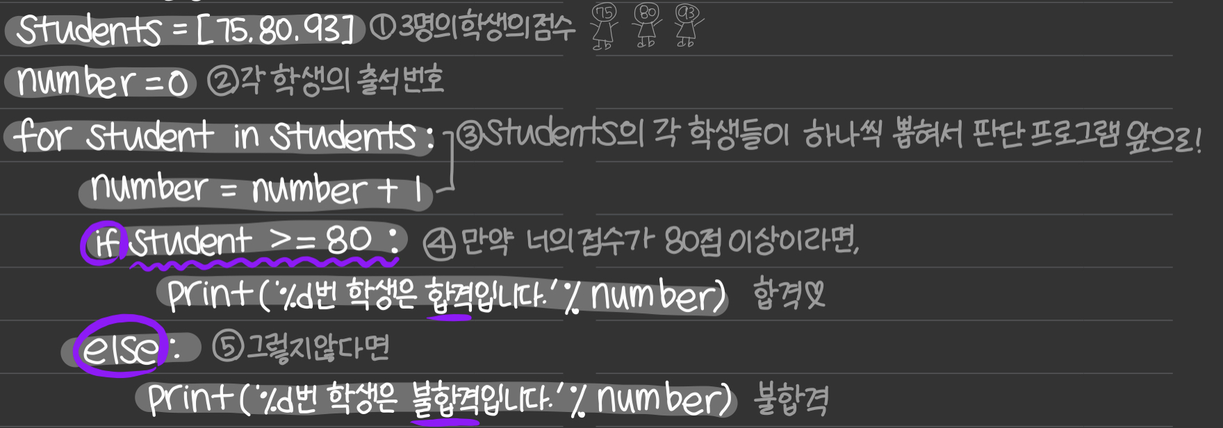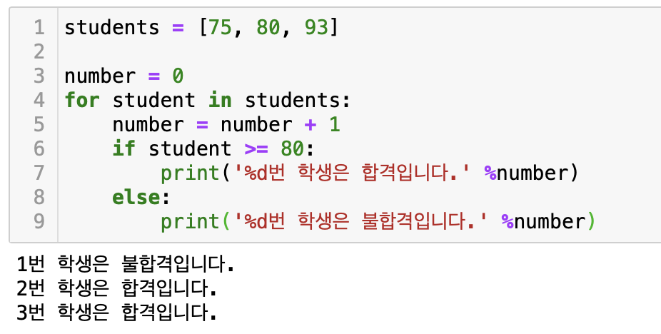 우선 3명의 점수를 하나의 리스트(students)로 나타낸다. 이때 각 학생에게 번호를 부여해주기 위해 number를 사용하였다. 그 후 리스트students에서 차례로 점수를 뽑아 임시로 설정한 변수 student에 대입하고, for문 안의 문장들을 수행한다. for문이 한번 수행될 때마다 number는 1씩 증가한다. 이를 출력해보면 각 학생이 합격인지 불합격인지 출력해준 것을 볼 수 있다.