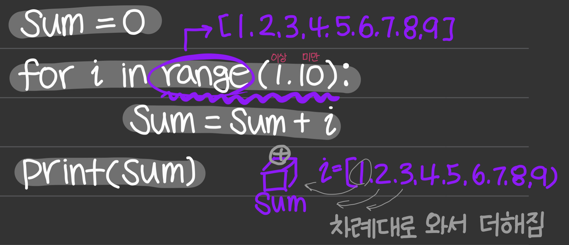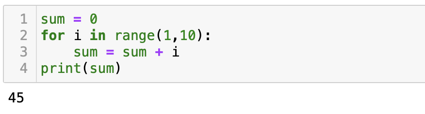 그렇다면 range함수를 이용하여 1부터 10 미만의 숫자들을 모두 더하는 프로그램을 만들어보자. 먼저 sum = 0으로 선언하여 하나의 변수를 만들어주고, for i in range(1,10)으로 1부터 9까지의 숫자를 하나씩 뽑아 변수 i에 넣는다. 이때 sum = sum + i 로 sum에 i의 값을 하나씩 계속 더해준 뒤 최종적으로 sum을 출력해보면, 1부터 9까지 더한 값인 45가 출력된다.