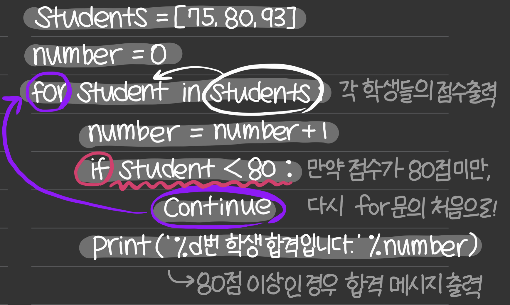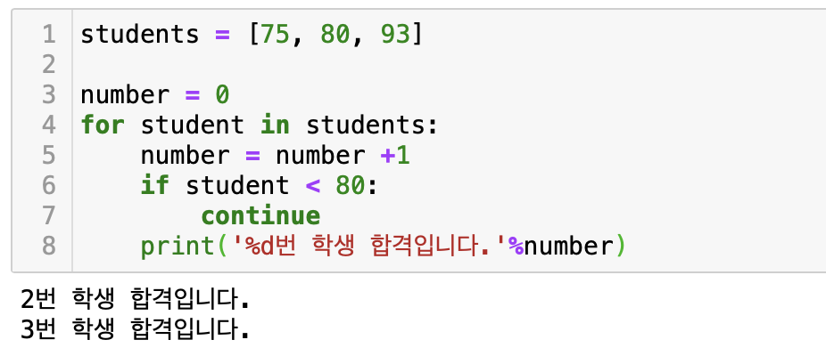continue를 이용하여 80점 이상 맞아 합격한 학생들에게 축하 메시지를 보내는 프로그램을 만들고자 한다. 이 경우 , if문을 이용해서 if student < 80 즉, 학생의 점수가 80점 미만일 경우 continue 그냥 for문 처음으로 돌아가고, 80점 이상일 경우에만 '%d번학생 합격입니다.'라는 문자를 출력하게 만들어주면 된다.