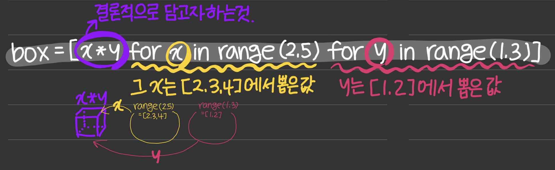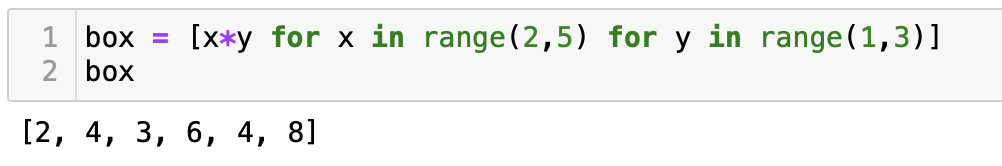본문 5번에 보면 이중 for문을 이용하여 구구단 프로그램을 만들었다. 구구단 프로그램 코드를 조금 더 간단하게 표현하면 box = [x *y for x in range(2,5) for y in range(1,3)]로 표현할 수 있다. 여기서 우리가 결론적으로 하고 싶은 것은 x*y인데, 이때 x는 range(2,5)에서 뽑은 각각의 값들이고, y는 range(1,3)에서 뽑은 각각의 값들이다.