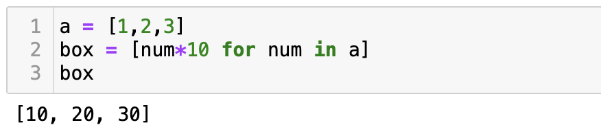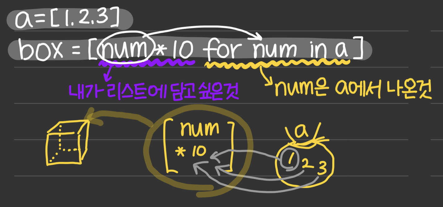box = [num*10 for num in a]를 해석해보자면 우리는 box에 담고 싶은 것은 num에 10을 곱한 값들의 리스트를 만들고 싶은 것이다. 이때 num이 어디서 나왔나?를 보면 for num in a 로, 리스트 a에있는 값들이다. 결론적으로 리스트a에 있는 각 값들 [1,2,3]을 하나씩 뽑아서 num이라는 임시 보관함에 넣어 각 10씩을 곱해주고 그 전체를 다시 box에 넣는 것이다 라고 생각하면 된다.