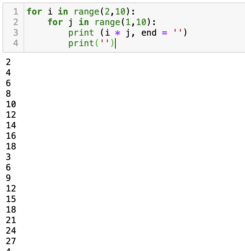 이중 for문을 사용하여 (for문 안에 또 다른 for문) 구구단을 실행하는 프로그램을 만들어보자. 먼저 for i in range(2,10)으로 2부터 10전까지 각각의 값들이 i안으로 들어가게 만든다. 다음으로는 그 for문 안에 for j in range(1,10)이라는 또 다른 for문을 넣어준다. 즉 우리가 구구단을 할 때 2단 (2*1, 2*2.... 2*9)를 실행한 다음 3단으로 넘어가는 프로그램을 만든 것이다. 이와 같이 이중 for문은 안쪽 for문이 다 완료되어야 바깥쪽에 있는 for문이 그다음 실행된다. (구구단에서 2단이 다 끝난 다음 3단으로 넘어감) 이때 end = ' '는 띄어쓰기를 해준다는 의미이다. (print함수의 옵션이라고 생각하면 됨)