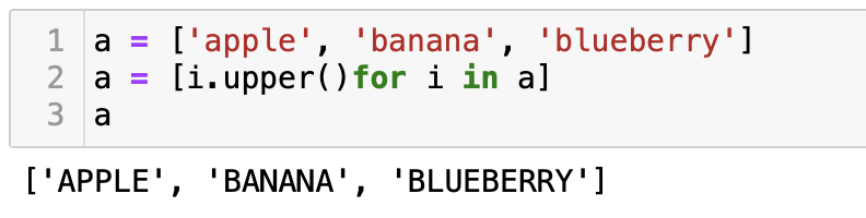 이번에는 소문자인 문자열을 for문을 이용하여 각각을 한번에 대문자 문자열로 바꾸어보자. 먼저 소문자 문자열이 들어있는 하나의 리스트를 만들어준 다음 upper( )함수를 사용하여 대문자 문자열로 변환시켜준다.