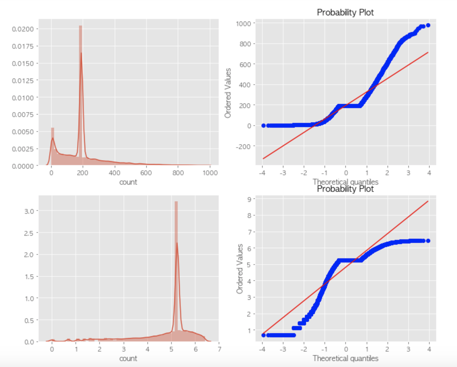 이번 연습에서 잘 안되었던 것 중 하나가 데이터가 정규분포를 그리고 있는지 확인하는 것인데, 사실 어떻게 하는 것인지 이해가 되지 않고 있다가. 참고 자료를 찾아서 따라 해 봤다. 원래 데이터를 가지고 정규성을 확인해 봤을 때는 위쪽의 2 그래프와 같이 정규성이 많이 깨져있는 것을 알 수 있었는데, 아웃라이어를 제거한 뒤 정규분포를 확인했을 때는 그 전보다는 정규성을 보이고 있다. 사실 이것도 완전한 정규분포라고 할 수는 없지만! 이러한 작업을 하기 전, 후를 비교했을 때 실제로 모델 평가 단계에서 R squred의 수치가 조금 상승했고, MSE는 하락했다.