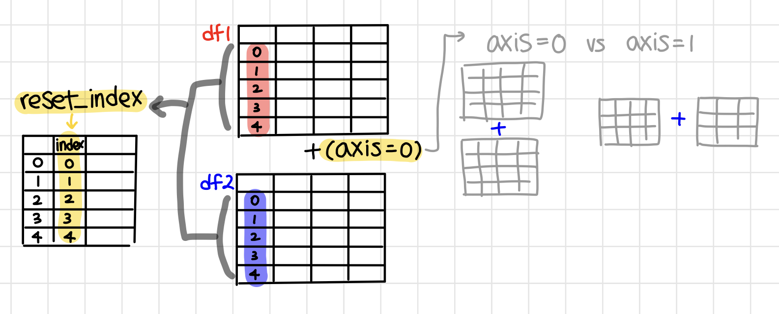 concat을 이용하여 두 데이터 프레임을 붙이는데, axis = 0이라는것은 아래에 붙인다는 의미이다. (df1 아래에 df2을 붙인다.) 이때 reset_index( )를 사용하는 이유는 두 데이터 프레임 모두 0부터 시작해서 번호가 매겨져 있기 때문에 그냥 붙이게 되면 인덱스가 중복이 되기 때문에 reset_index를 해주는 게 좋다.