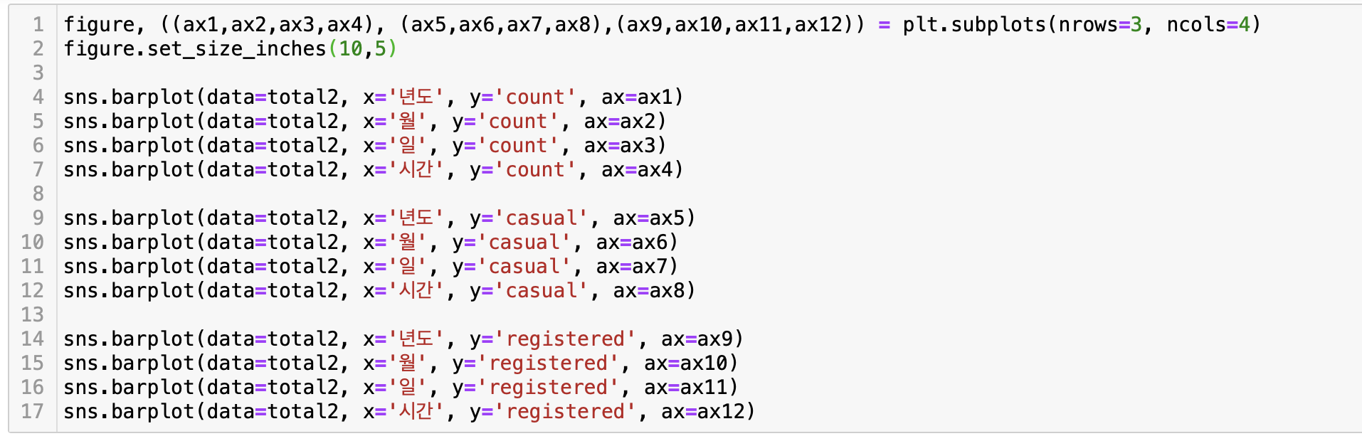📌 subplot ➰실제로 썼던 코드 ➰ 간소화해서 정리 figure, ((ax1, ax2), (ax3, ax4)) = plt.subplots(nrows=2, ncols=2) figure.set_size_inches(16,8) sns.barplot(data=total2, x='년도', y='count', ax=a..