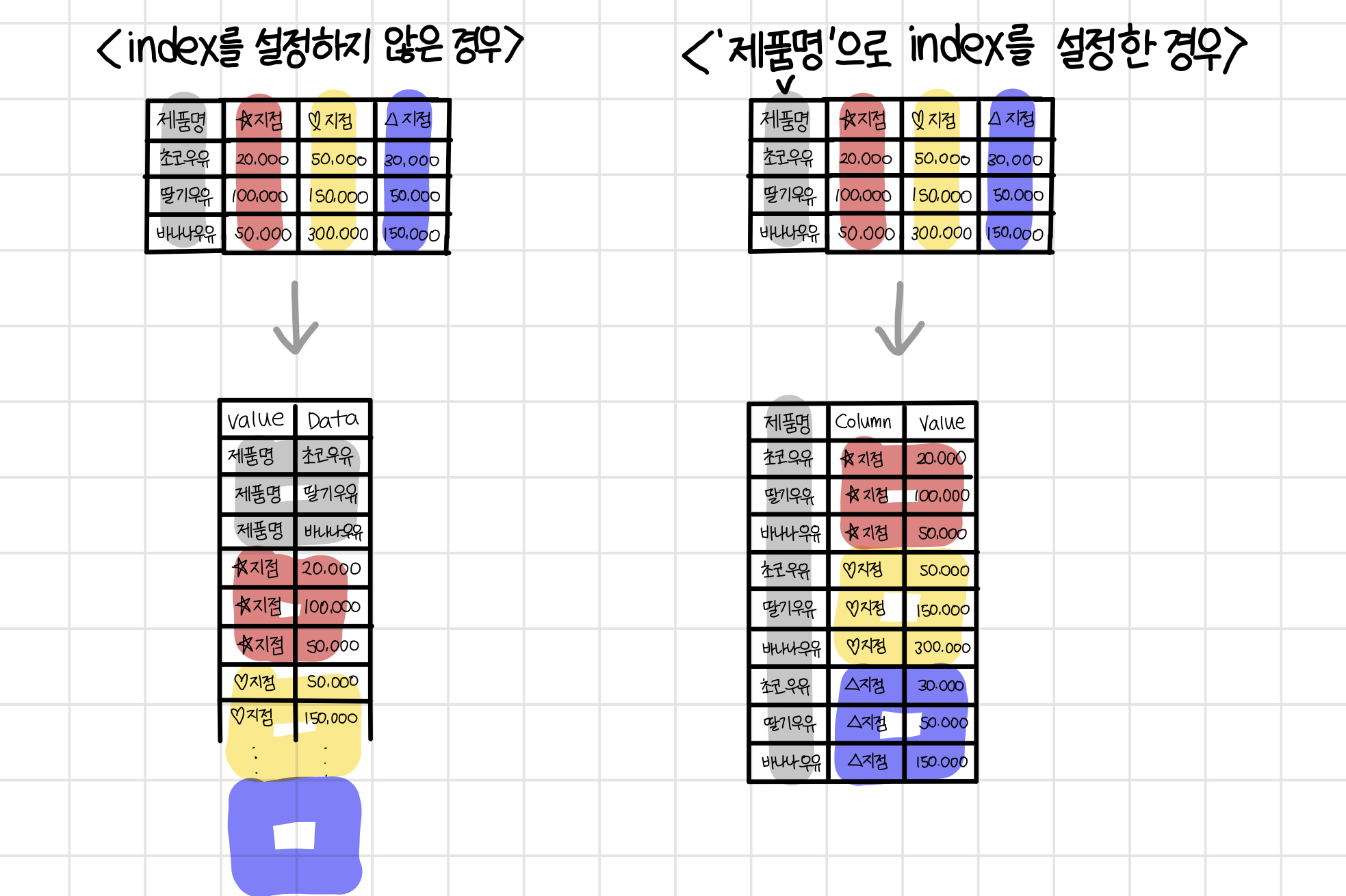 stack을 적용할때 index를 설정하지 않고 하는방법과 특정 columns을 인덱스로 지정해서 stack하는 방법이 있다.