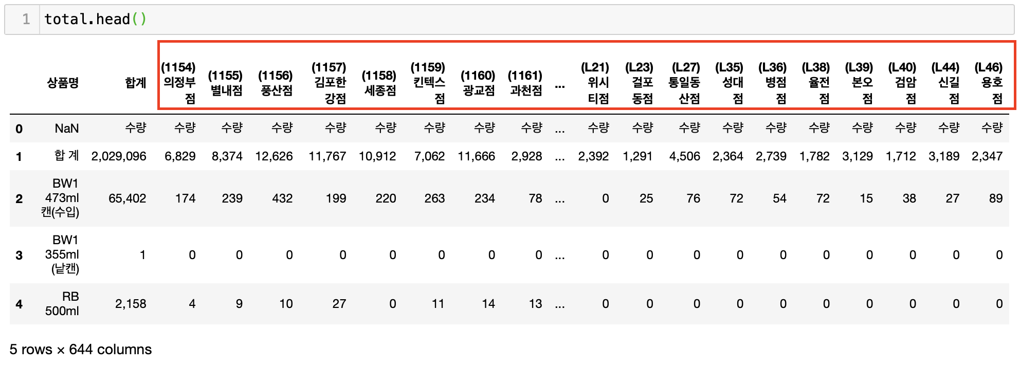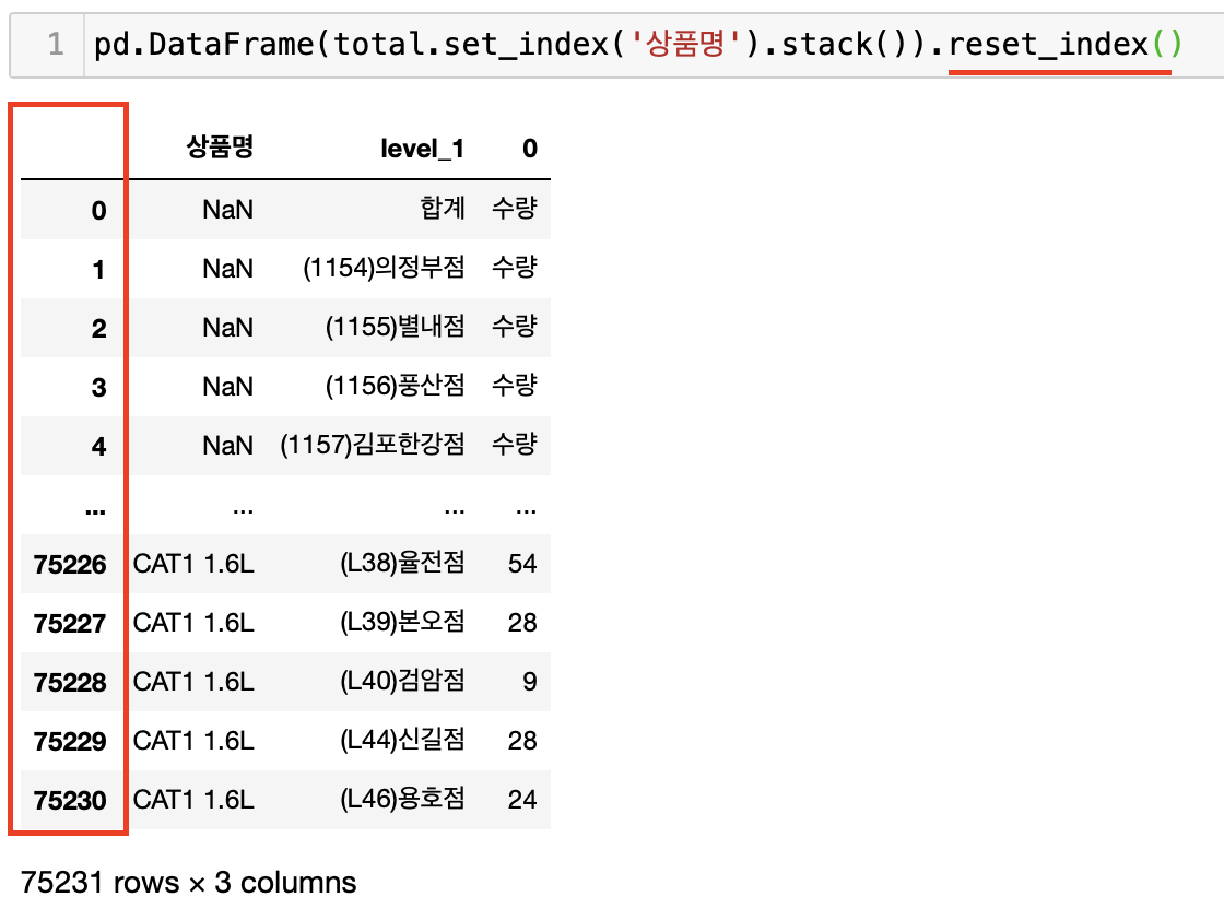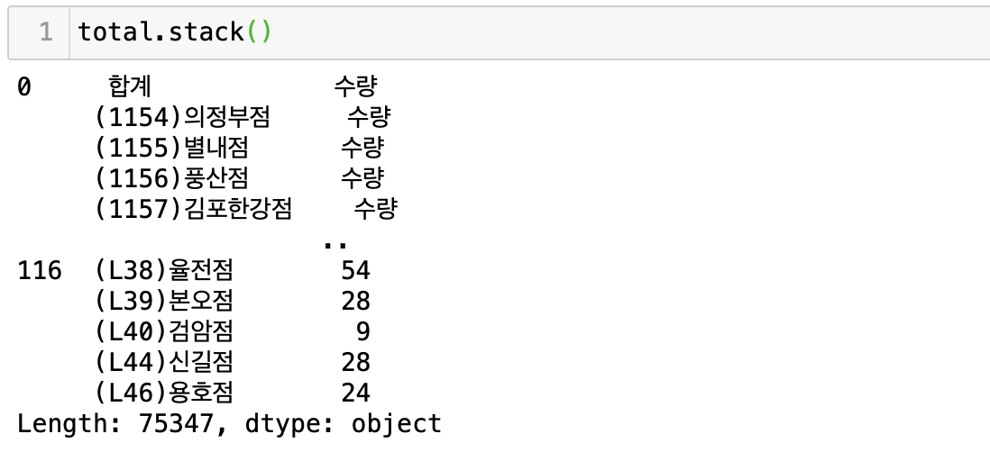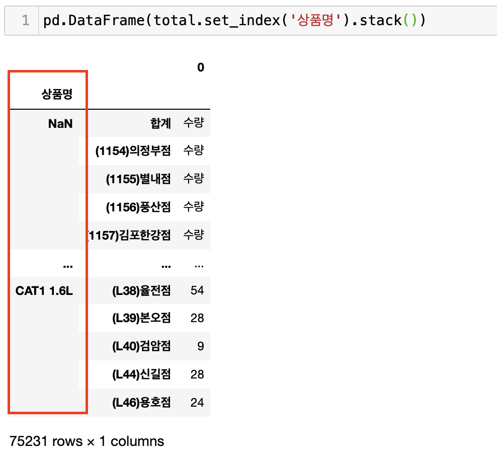 정형 데이터에서 가장 중요한것은 각각의 columns들이 모두 독립적이어야 한다는것이다. 하지만 위의 데이터 프레임을 보면 점포가 각각의 columns로 들어가있기때문에 서로 독립이 되어있지 않음을 알 수 있다. 즉, 각 점포에 제품별 판매량이 합계로 합쳐지기 때문에 columns가 서로 영향을 주고 있는것이다. 이러한 경우 stack( )을 사용하여 데이터 프레임을 재구조화 시켜주어야 한다.