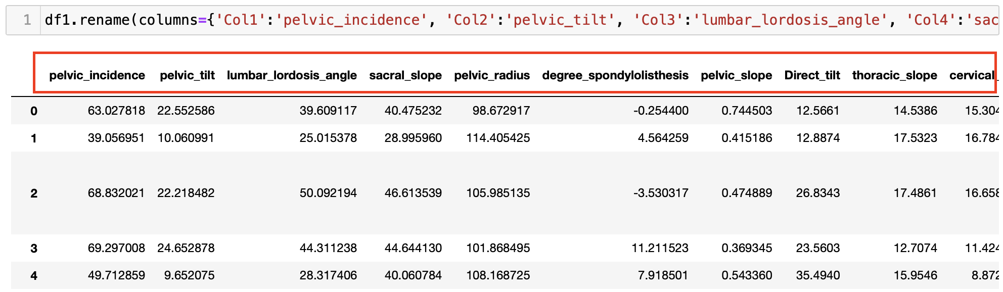 위의 코드 중 일부만 보자면, df1.rename(columns={'Col1':'pelvic_incidence', 'Col2':'pelvic_tilt', }) 처럼 중괄호{ }안에 {'현재칼럼이름' : '바꾸고자 하는 이름'}형태로 적어준다.