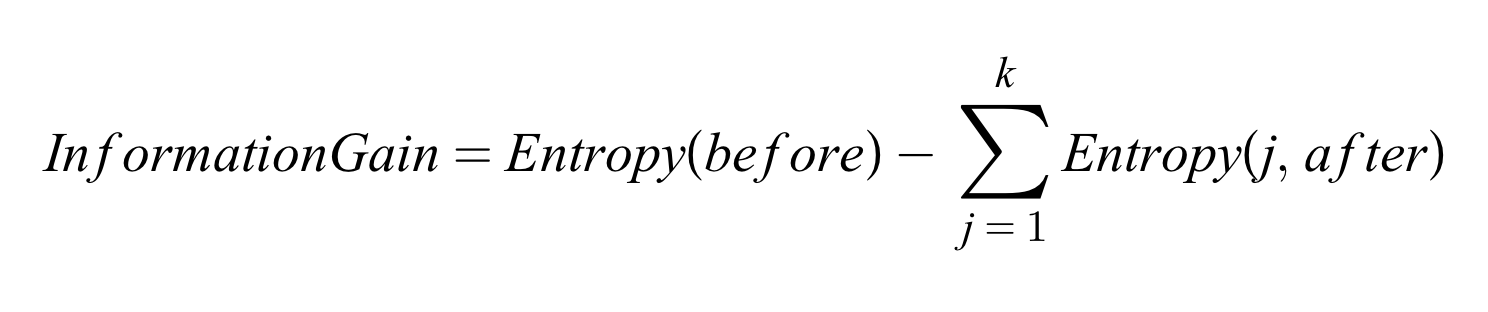 엔트로피 개념을 이용하여 '정보 이익'이라는 개념을 만들 수 있는데, 정보 이익은 정보의 가치를 의미하며 그 값이 클수록 좋다. 위의 계산식을 보면 정보 이익(IG)은 '사전 엔트로피(불확실성)'에서 '사후 엔트로피(불확실성)'을 뺏 값이다. 따라서 IG는 '불확실성이 얼마나 줄어들었는가?'로 해석할 수 있으며, 이 값이 크다는 것은 불확실성이 많이 감소했다는 것을 의미한다.