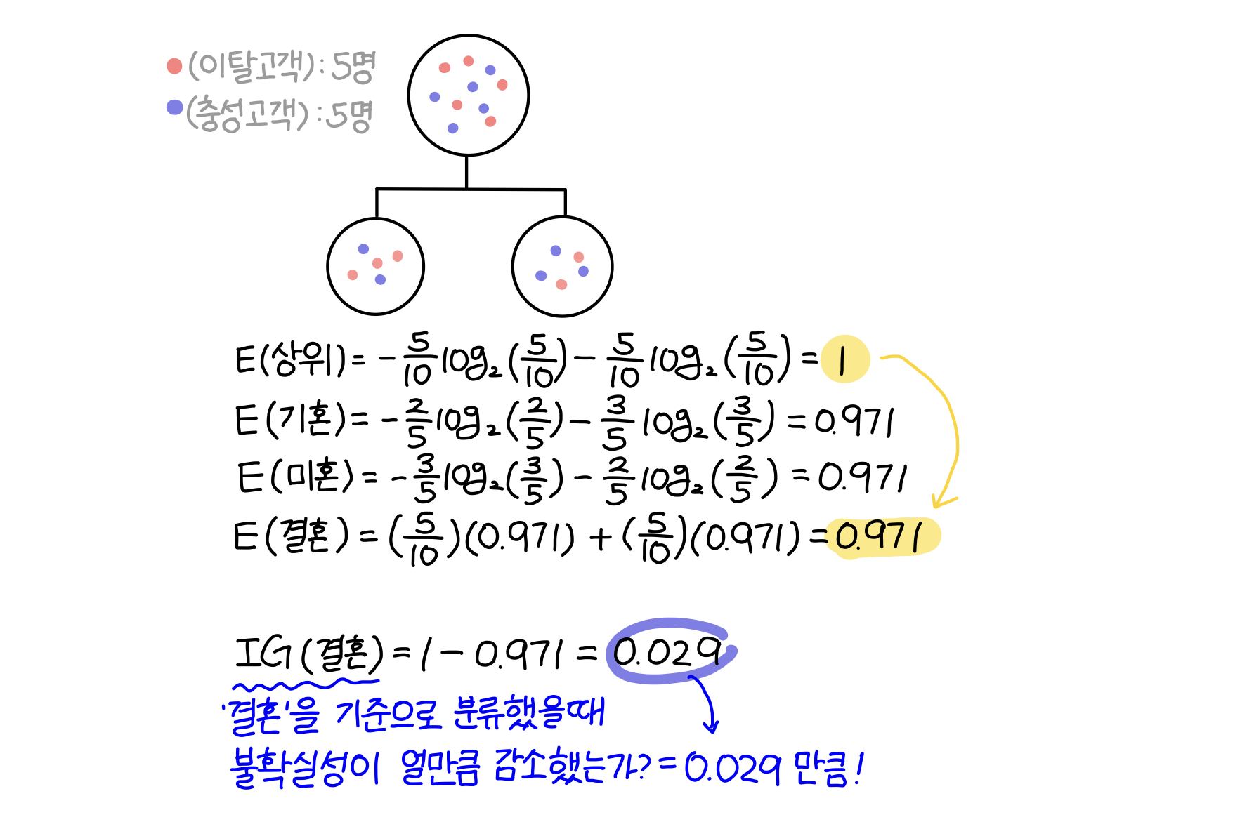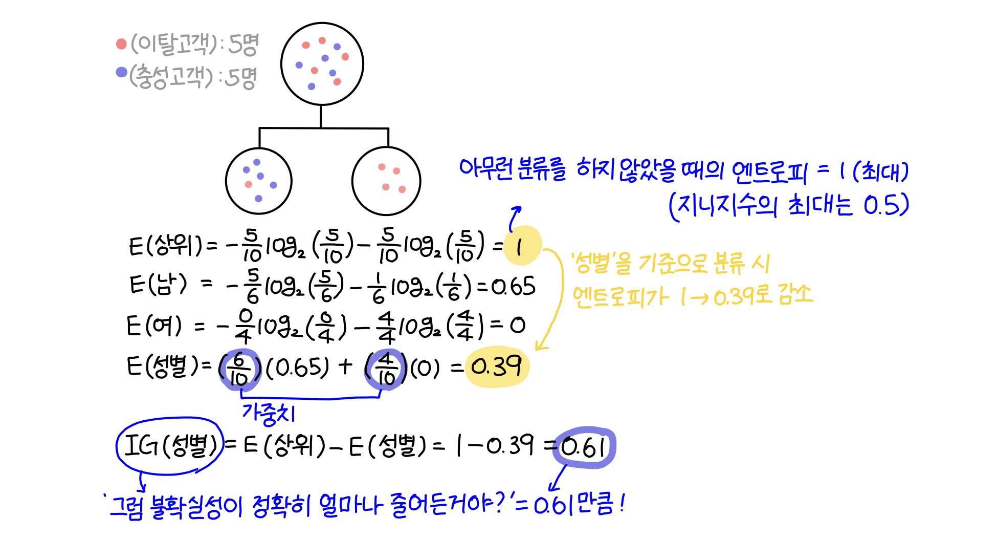 해당 집단을 '성별'에 따라 분류했을 때는 엔트로피가 1에서 0.39으로 0.61만큼(IG) 감소했고, '결혼 유무'에 따라 분류했을때는 엔트로피가 1에서 0.971로 0.029만큼 감소했다. 따라서 이탈 고객(빨간색)을 파악하기 위해서는 '성별'에 따라 해당 집단을 분류하는 것이 좋다.