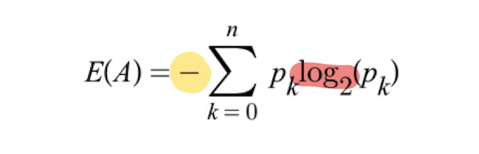 위의 공식을 보면 알 수 있듯, 엔트로피는 로그(log)를 사용하여 계산한다. 그런데 왜 - log로 계산하는 것일까? 엔트로피는 정보이론에서 나왔는데, '정보 이론'은 정보량이 얼마나 많은지 계산하는 이론이다. 컴퓨터는 bit(0과 1)로 구성되어 있기 때문에 log2(로그 2)에 어떤 값을 넣어 불확실성과 정보량을 계산하는 원리인 것이다. 따라서 엔트로피를 계산할 때 (-)가 붙은 이유는 전체 개수 중에 속해있는 개수를 구하다 보니 (pk) 부분이 항상 분수 형태가 나오게 되고, 거기에 로그를 붙이면 항상 (-)로 값이 나오기 때문에 (+)로 전환하기 위해 앞에 (-)를 붙여주는 것이다.