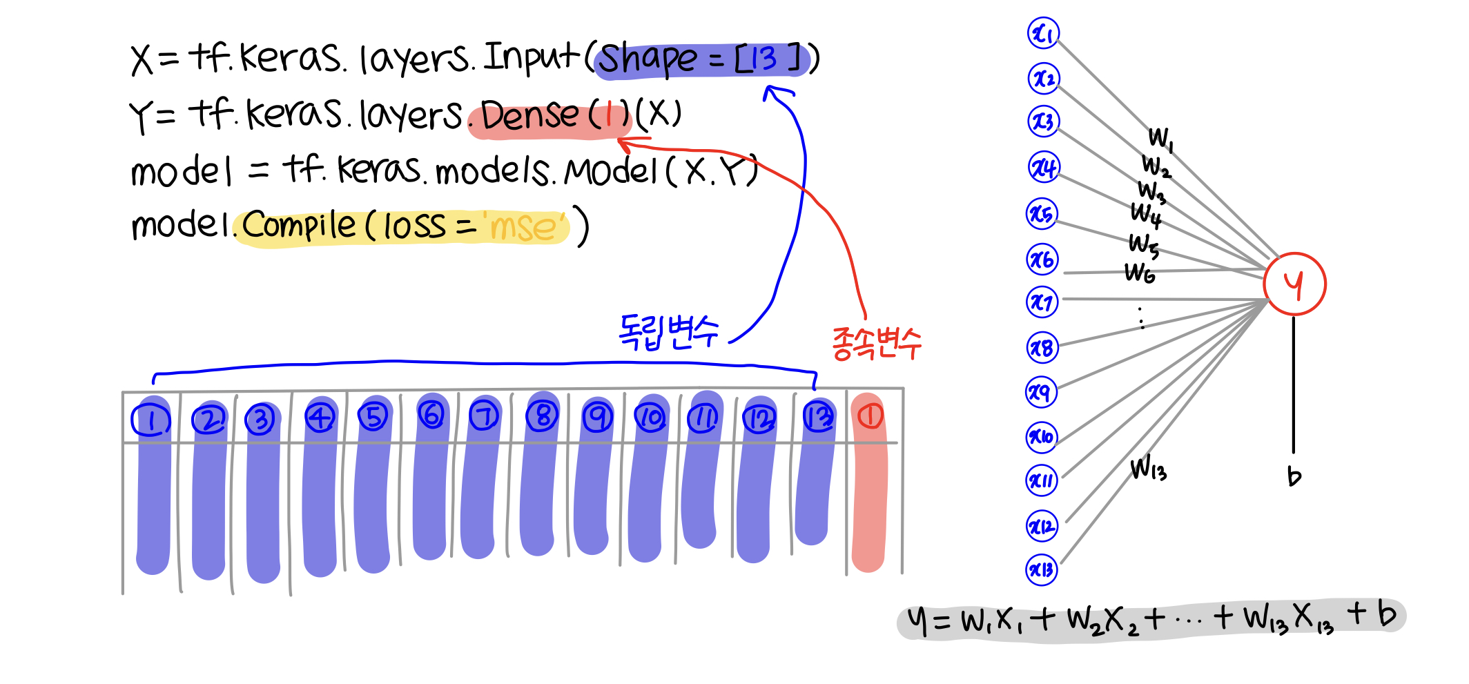 위의 코드를 그림으로 표현할 수 있는데, 먼저 독립변수가 13개이므로, shape에 13을 적어주었다. 이는 13개의 입력을 받는 입력층을 구성한다고 볼 수 있다. 종속변수는 1개이기 때문에 코드 두 번째 줄의 Dense layer에는 1을 적어주었다. 따라서 이를 그림으로 표현하면 1개의 출력층을 구성한다고 볼 수 있다. 조금 더 정확하게 표현하면 두 번째 코드는 13개의 입력을 받아 1개의 출력을 만들어내는 구조를 만든다 1개의 출력을 만드는 구조를 수식으로 표현하면 Y = W1X1 + W2X2 +... + W13X13 + b로 표현한다. 컴퓨터는 학습과정에서 입력되는 데이터를 보고 이 수식의 W와 b를 찾는다.