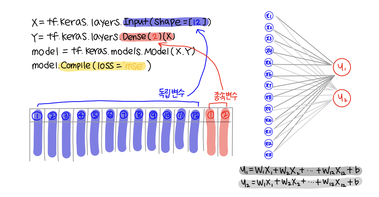 이번에는 독립변수가 12개, 종속변수가 2개라고 가정하고 모델을 만들어보자. 이러한 경우 Input layer의 수는 12, Dense layer의 수는 2로 설정한다. 하나의 결과를 만드는 데에는 1개의 수식이 필요한데, 현재 종속변수가 2개이므로 2개의 수식이 필요하다. 따라서 이러한 경우 퍼셉트론 2개가 병렬로 연결된 구조가 형성되며, 컴퓨터가 찾아야 하는 가중치의 개수는 첫 번째와 두 번째 수식에서 각 12개의 W와 1개의 b로 즉, 26개를 찾아야 한다.