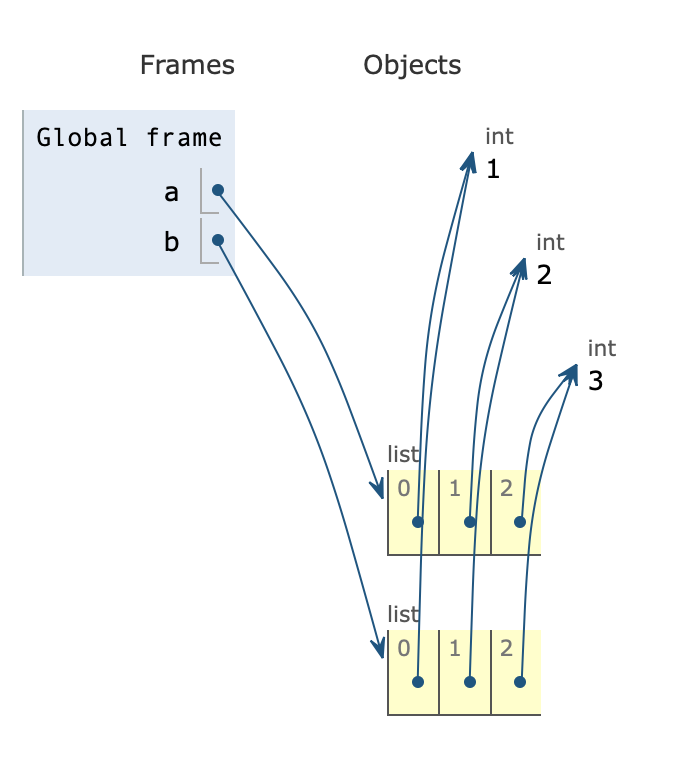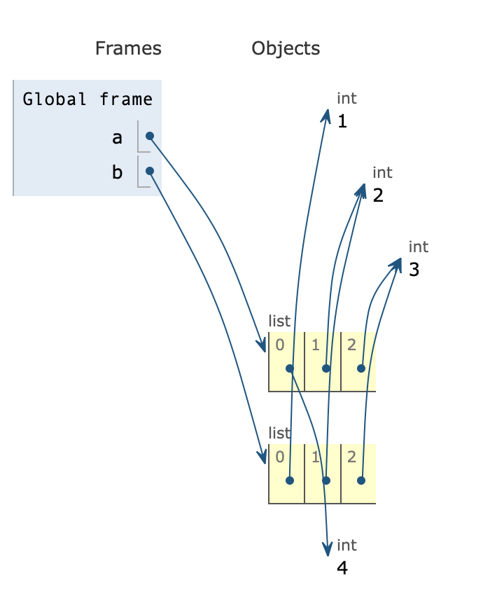 다음으로 b = a로 변수 b에 a리스트의 주소를 넣었다. 위의 그림을 보면 알 수 있듯, a와 b가 같은 곳을 가리키고 있다. (즉, a 와 b의 주소가 같다.)
