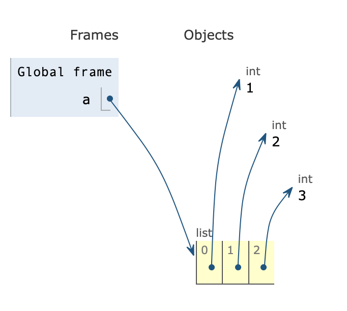 첫 번째로, 아까와 같이 a = [1,2,3] 으로 하나의 리스트를 만들어 넣어준다. 이때 a리스트의 각각의 방에 1,2,3이 들어가 있는 것을 알 수 있다.