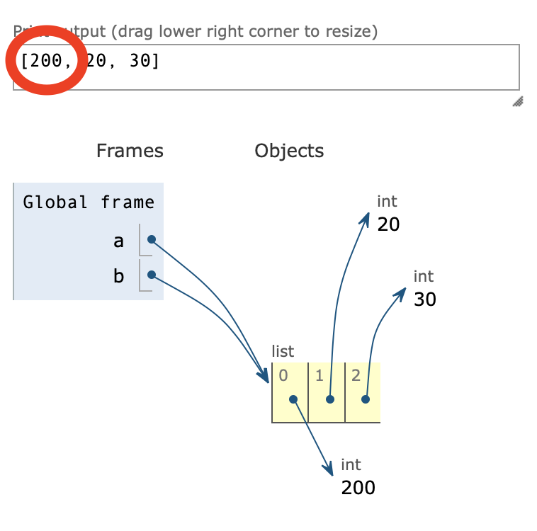 마지막으로 print(b) 라는 코드를 작성하여 b에 들어가 있는 값을 출력해보면 [200, 20, 30]이 나온다. 즉 리스트의 첫 번째 값이 10에서 200으로 바뀐 것을 알 수 있다. 우리는 a의 값을 바꿨는데 왜 b의 값도 같이 바뀌었을까?여기서 아까 언급했던 '주소'를 저장한다는 개념을 이해해하는 것이 필요하다. b = a에서 a의 값이 복사되어 b에 들어간 것이 아니고 a의 '주소'를 가지고 있는 것이다. 즉 a와 b가 같은 곳을 바라보고 있기 때문에 a의 값을 바꾸면 b의 값이 같이 바뀌게 되는 것이다.