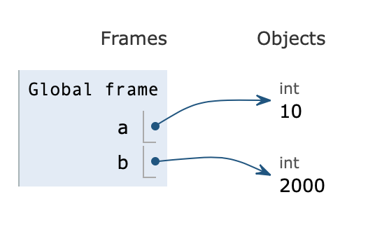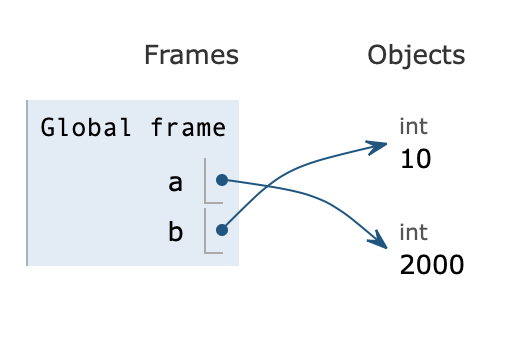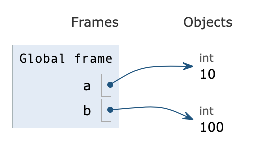 그전에 기본적으로 변수에 대해 알고 넘어가야 할 것이 있다. 우리가 변수를 선언하면 램에 있는 메모리 공간에 데이터를 저장할 수 있는 공간이 각각 할당된다. a = 10을 위에서는 쉽게 설명을 하기 위해 10을 a에 담는다고 했지만 조금 더 정확히 말하자면 '10'이 있는 주소를 'a'라는 상자(변수)에 넣는 것이다. 같은 원리로 b =100 은 100이 있는 주소를 b라는 변수에 넣는다고 생각하면 된다. 처음 접했을 때 조금 어려운 개념일 수도 있지만, 예를 들어 box = '나'라고 선언했을 때 그 box에 내가 직접 들어가는 게 아니라 내가 있는 주소가 적힌 종이를 상자에 넣는다 라고 생각하면 쉬울 것 같다.
