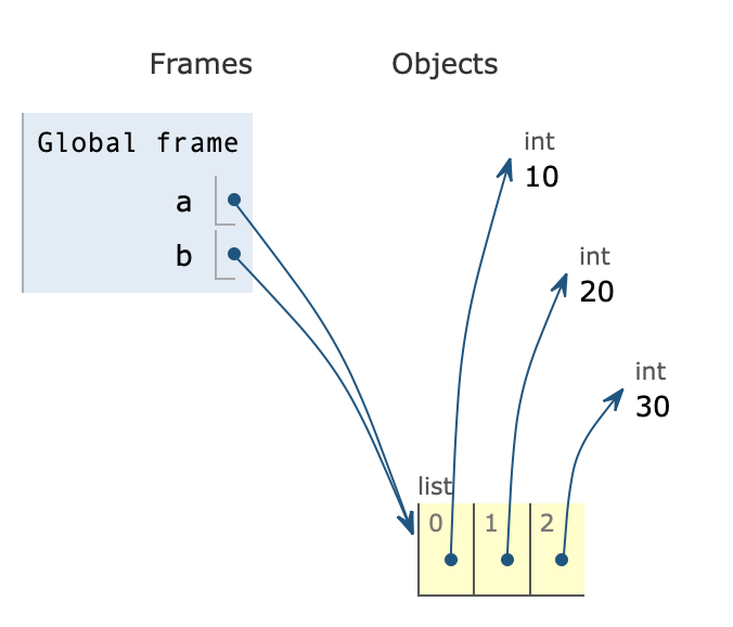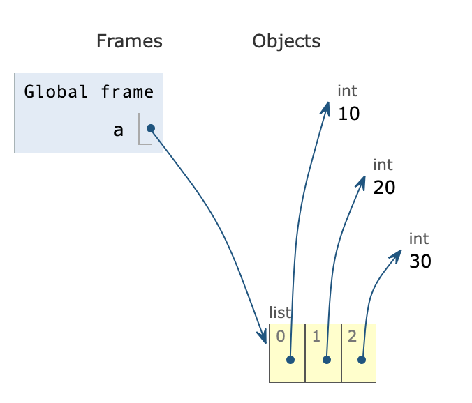 변수에 대한 기본적인 것들을 공부했으니 이번에는 조금 더 심화 내용을 알아보기로 한다. 변수 a에 [10, 20, 30]이라는 리스트 값을 넣는다. a는 그 리스트가 있는 주소를 담게 되고, 리스트의 각각의 방에는 10,20,30의 값이 들어가 있다.