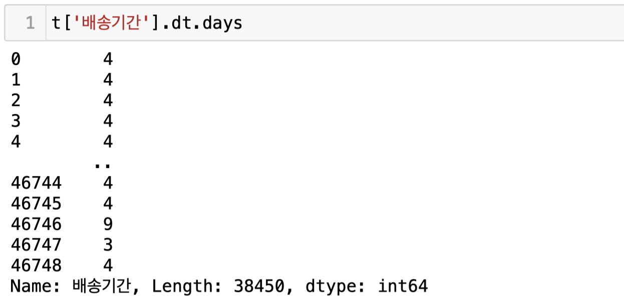 해당 columns('배송기간')의 값들은 '일(days)' 형태의 데이터이다. 따라서 .dt.days 를 이용해 보면 timedelta 형태의 데이터가 우리가 원하는 형태인 Int형으로 변환되었음을 알 수 있다.