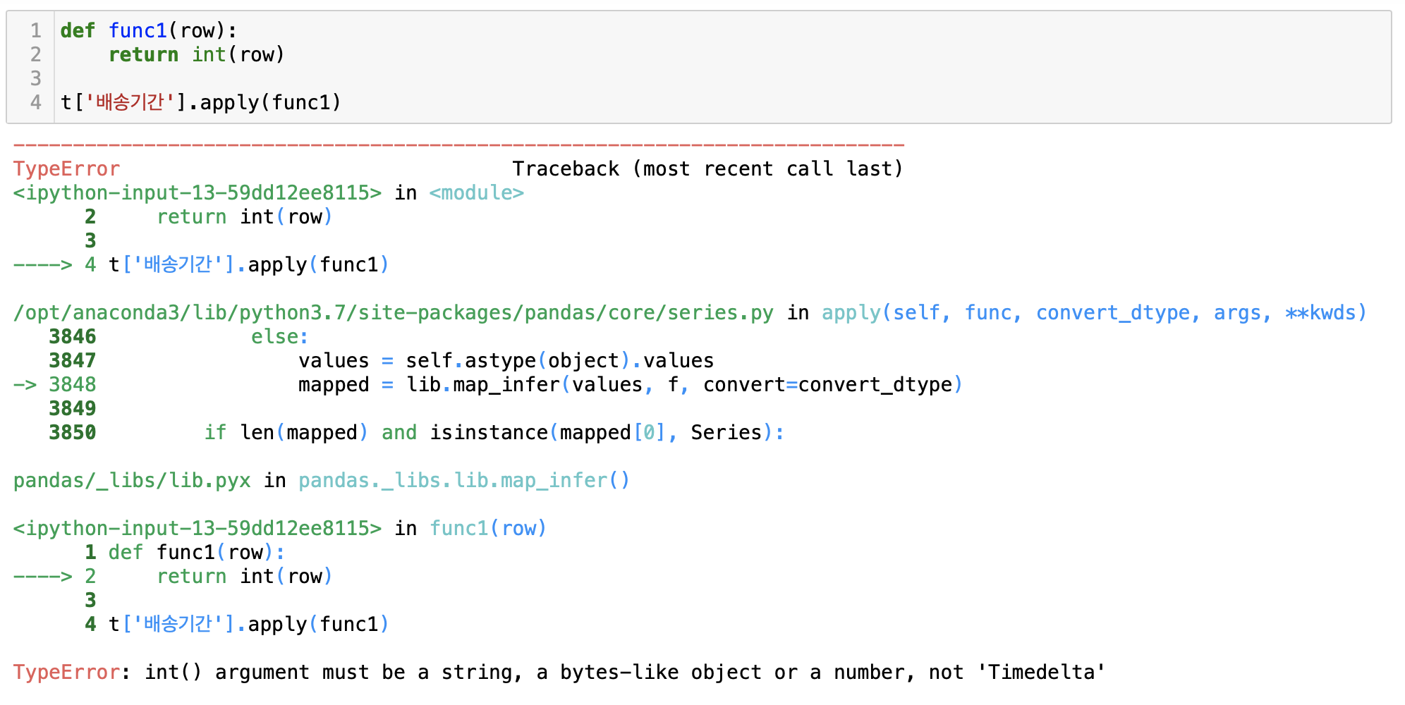 int( ) 를 이용하여 '배송기간' columns의 값을 int형태로 변환하면 에러가 뜨는 것을 확인할 수 있다.
