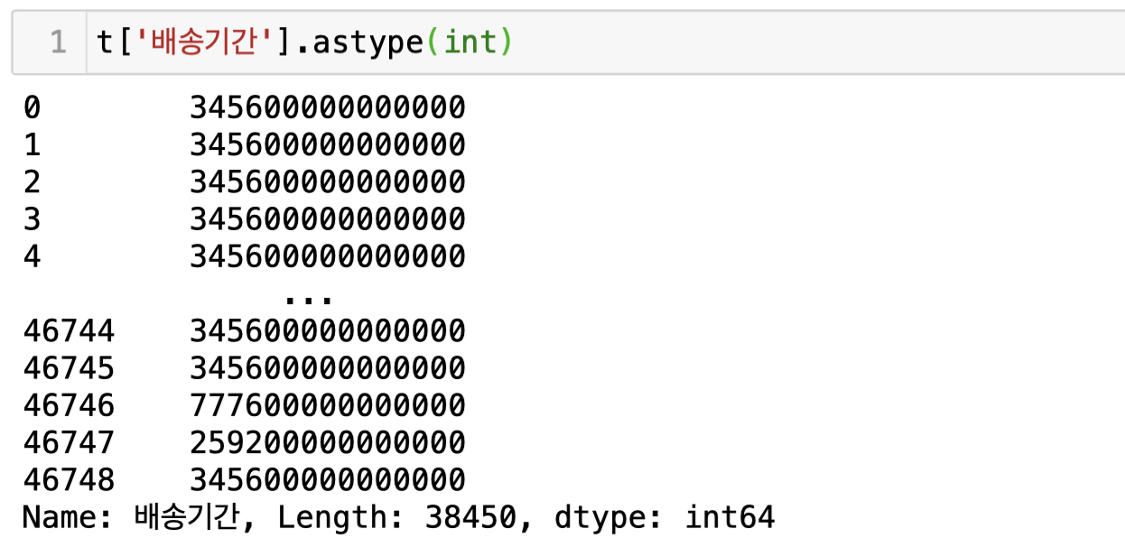 먼저 전체 데이터 프레임(위의 경우는 t라고 지정)을 확인한 뒤 '배송기간'이라는 columns의 값만 추출해온다. '배송기간' columns의 값들은 '일수'형태의 값들이며 timedelta 타입의 데이터임을 알 수 있다. 이때 timedelta 형태의 데이터를 Int형태로 변환하려면 어떻게 해야 할까?