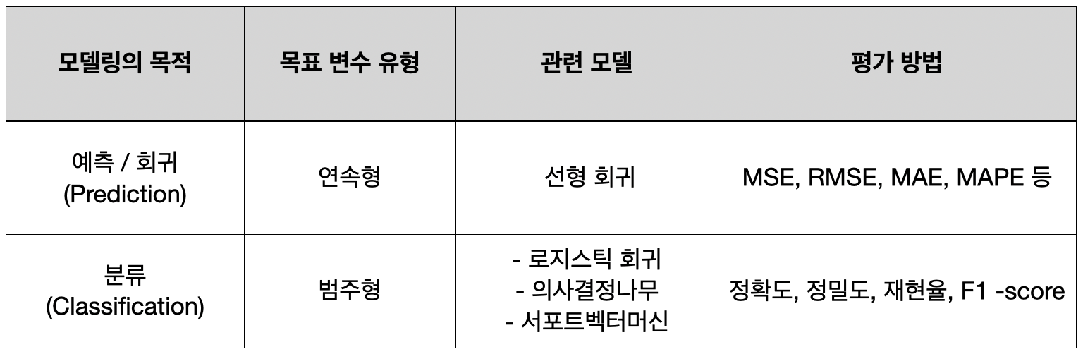 - 모델링의 목적 또는 목표 변수의 유형에 따라 다른 평가지표를 사용한다.