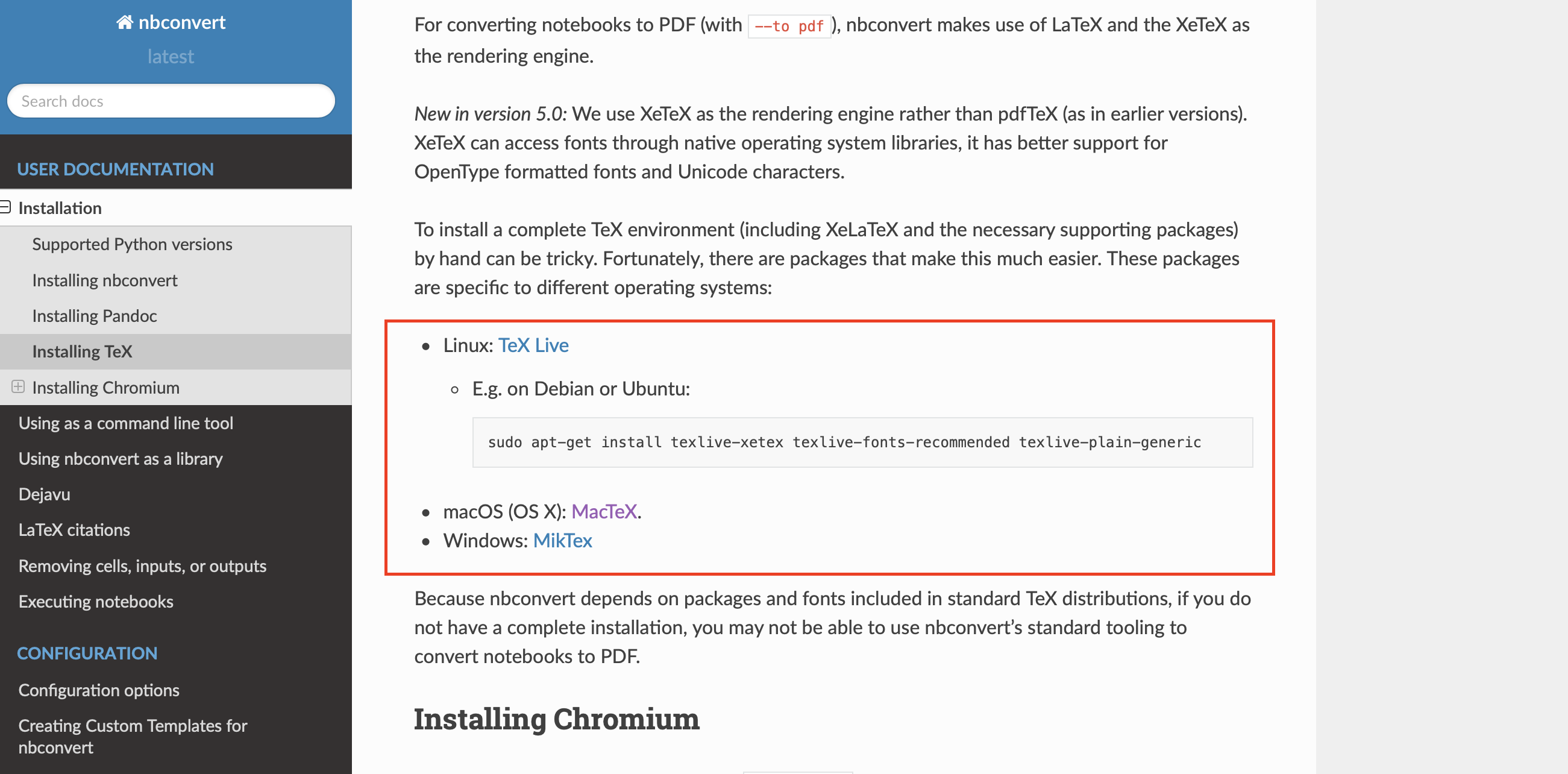 https://nbconvert.readthedocs.io/en/latest/install.html#installing-tex