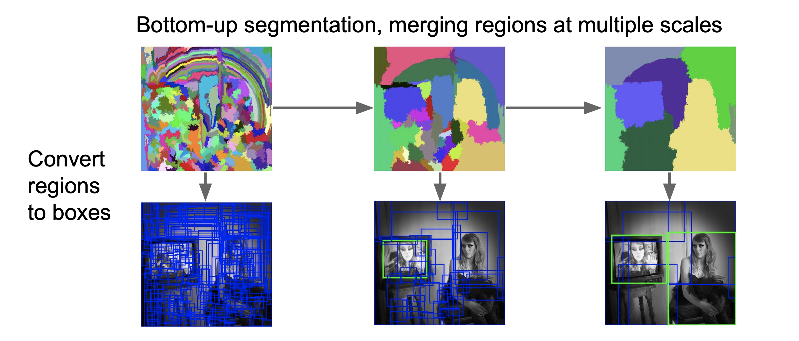 region proposal을 적용하는 두 번째 방법은 selective search이다. 이는 어떠한 이미지에서 색상/텍스쳐가 유사한 픽셀끼리 묶어주는 것부터 시작한다. 그다음 픽셀 단위보다 조금 더 크게 덩어리 짓고, 또 한 번 merge 하여 더 큰 덩어리로 만들어주어 region proposal을 하는 것이다. 즉, 이미지 전체를 convolution으로 검사하는 것이 아니라 위의 사진에서, 초록색 네모 부분만 가지고 검사하도록 하여 훨씬 효율적으로 처리할 수 있게 된다.