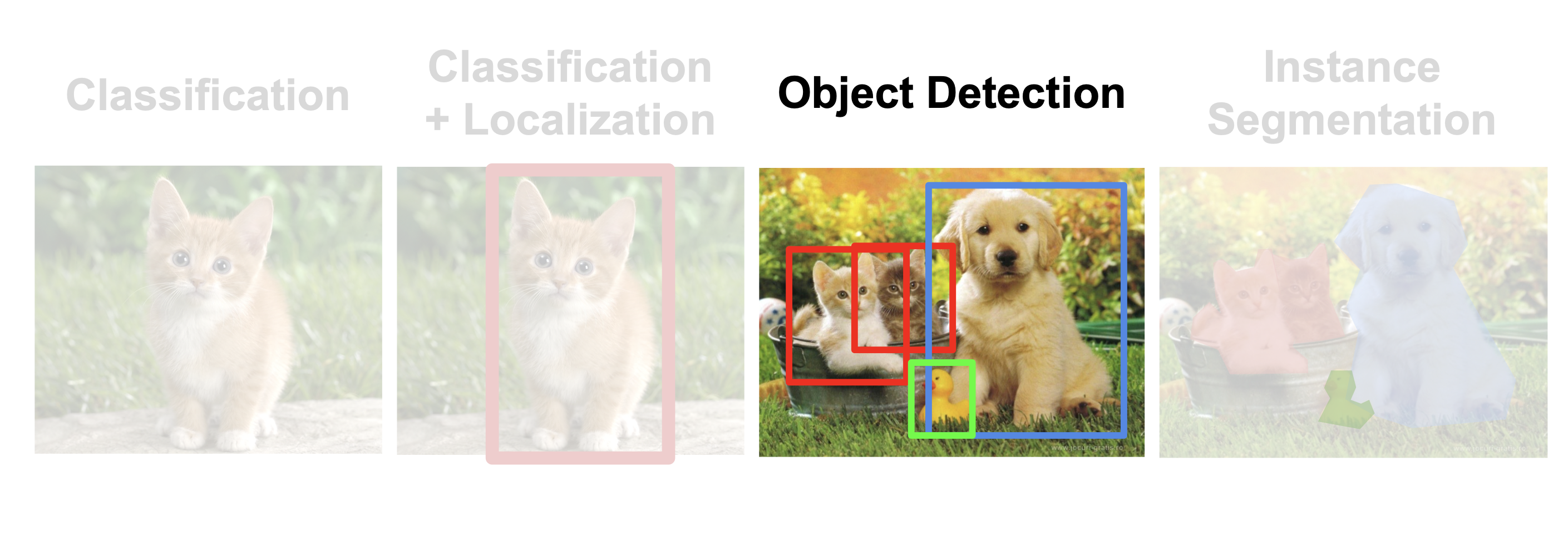 이미지 내에서 사물을 인식하는 방법에는 다양한 유형이 존재하는데, 그중 Object detection에 대해 정리하고자 한다. Object detection은 이미지내에 불특정 다수의 object가 있을때, 각 object의 위치와 클래스정보를 알려주는 것이다. object detection을 접근하는 아이디어는 크게 2가지가 있다. 예를 들어, 한 장의 이미지에 고양이, 강아지, 오리 등의 다양한 object가 있을 때 고양이(클래스)는 여기에(위치), 강아지는 저기에 이러한 정보를 맞추는 것이다.