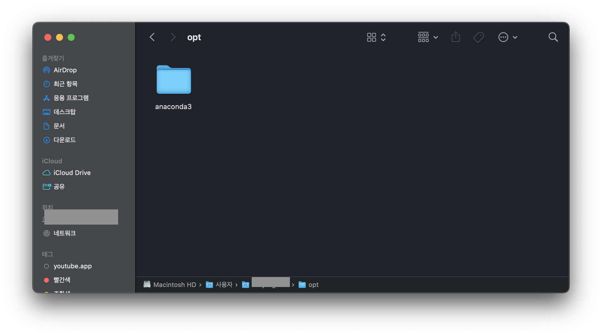 'Finder' -> command + shift + G -> User/username/opt 까지 가면 anaconda3 폴더가 있다.