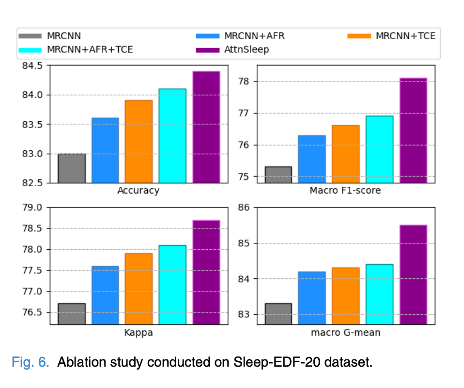 이때 AttnSleep의 각 모듈의 효율성을 분석하기 위해 Ablation Study를 진행했다.